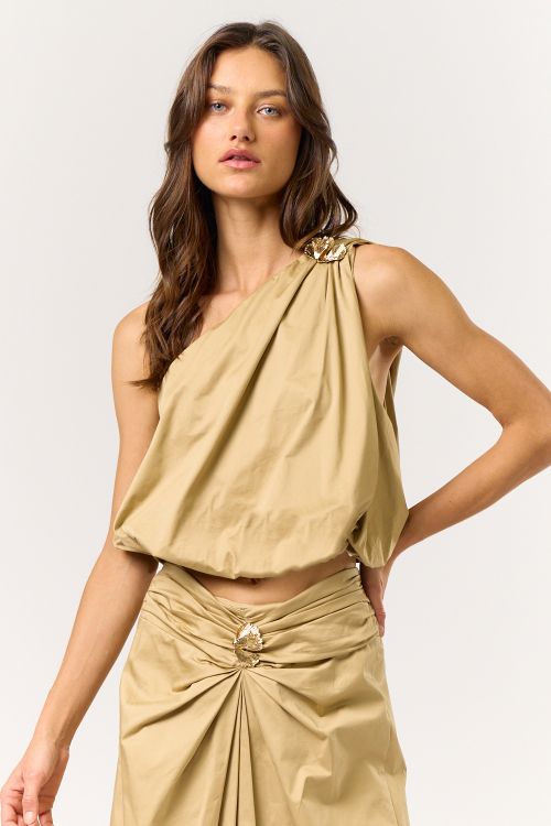 One shoulder bubble hem top with gold leaf detail is a stunning, sophisticated choice for this Holiday Season. The one-shoulder design adds a modern, elegant touch, while the bubble hem creates a flattering, voluminous silhouette. The gold leaf detailing in skirt and top brings a hint of luxury and shine, making it perfect for special occasions or relaxed vacation days